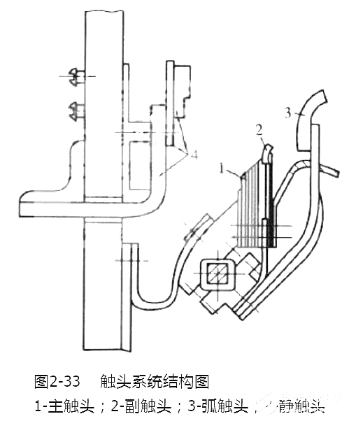 The working procedure of the third gear contact breaking the load is to first break the main contact, then the auxiliary contact, and finally the arc contact, so that the arc is extinguished between the arc contacts; when closing, the sequence is opposite, the arc contact is closed first, then the auxiliary contact is closed, and finally the main contact is closed. The structure of the contact system is shown in Figure 2-33.